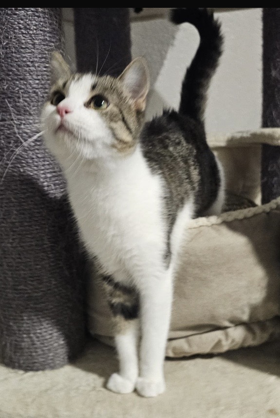 Hugo wurde in der Pflegestelle geboren und verbrachte viele Wochen dort gemeinsam mit Mama und seinen Geschwistern, er kam im April 2025 zur Welt und wuchs wohlbehütet in einem sicheren Umfeld auf. Hugo ist ein sehr zutraulicher, verschmuster und einfacher Jungkater, der genügsam ist und sehr sozial im Umgang mit anderen Artgenossen. Hugo war zusammen mit Romina aus der Gruppe zwischenzeitlich in ein neues zu Hause vermittelt worden, aber vor allem Romina kam dort gar nicht gut zurecht. Im Haushalt waren Kleinkinder und wir vermuten es war ihr einfach zu laut und zu unruhig. Die Entscheidung fiel daher sie beide wieder aufzunehmen. Seither waren die zwei Katzen auf der Station in einer Gruppe Gleichaltriger unter gebracht. Romina ist mittlerweile zutraulich und sehr verschmust, sie mag es aber immer noch gerne nicht so hektisch und lieber ruhiger, sie hält sich gerne generell fernab von aller Unruhe und sucht sich meist ein stilles Plätzchen, daher entschieden wir nun sie getrennt von Hugo zu vermitteln. Hugo ist eher ein „Hansdampf in allen Gassen“ und recht agil, bei Besuch von Interessenten hat er keine Probleme sich zu zeigen und daher auch einzeln gute Chancen auf ein zu Hause. Hugo ist bereits kastriert , gechippt, tätowiert und geimpft und dürfte jederzeit ausziehen einzeln mit Freigang, mit einem Kumpel aus der Gruppe oder natürlich auch zu vorhandenen Katzen im Haushalt.